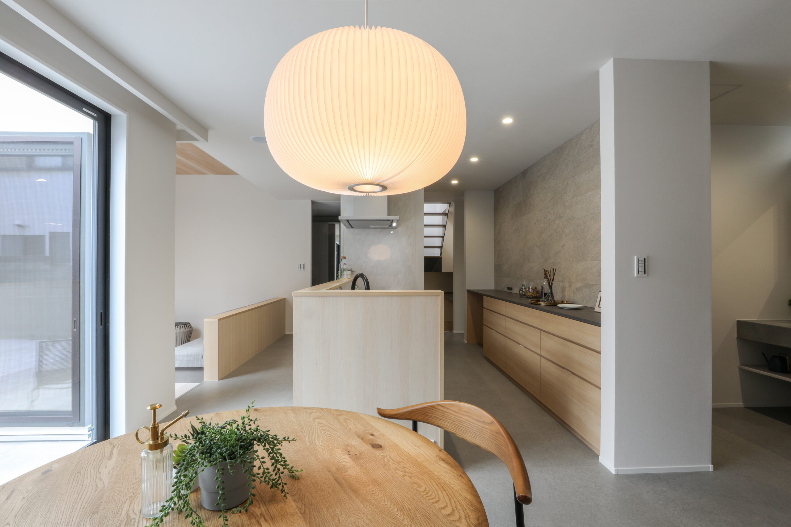 料理をしながら会話が生まれ、ふと見上げれば、柔らかな灯りがダイニングを包み込む。