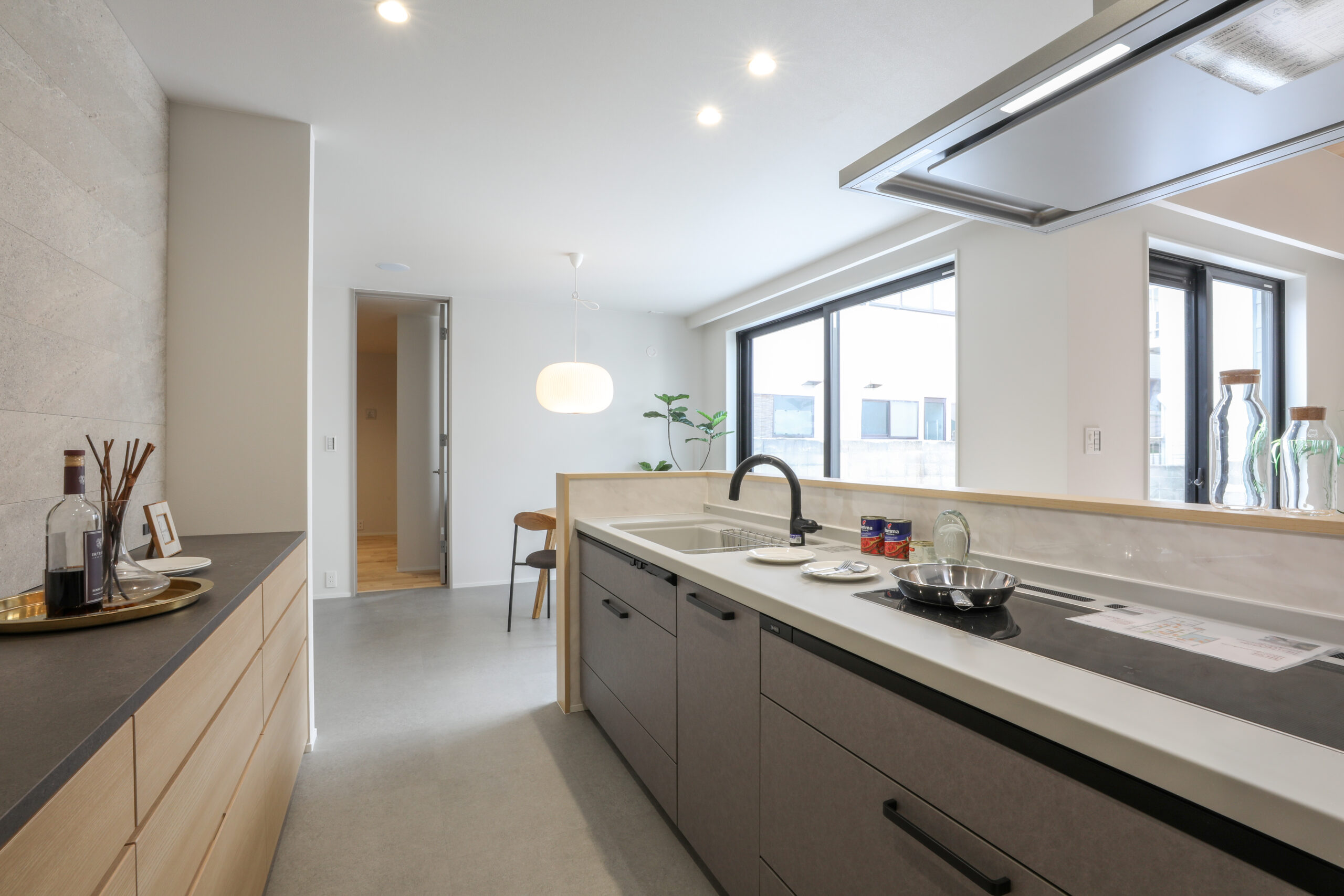 キッチンからダイニング、そしてリビングへと続く動線は、