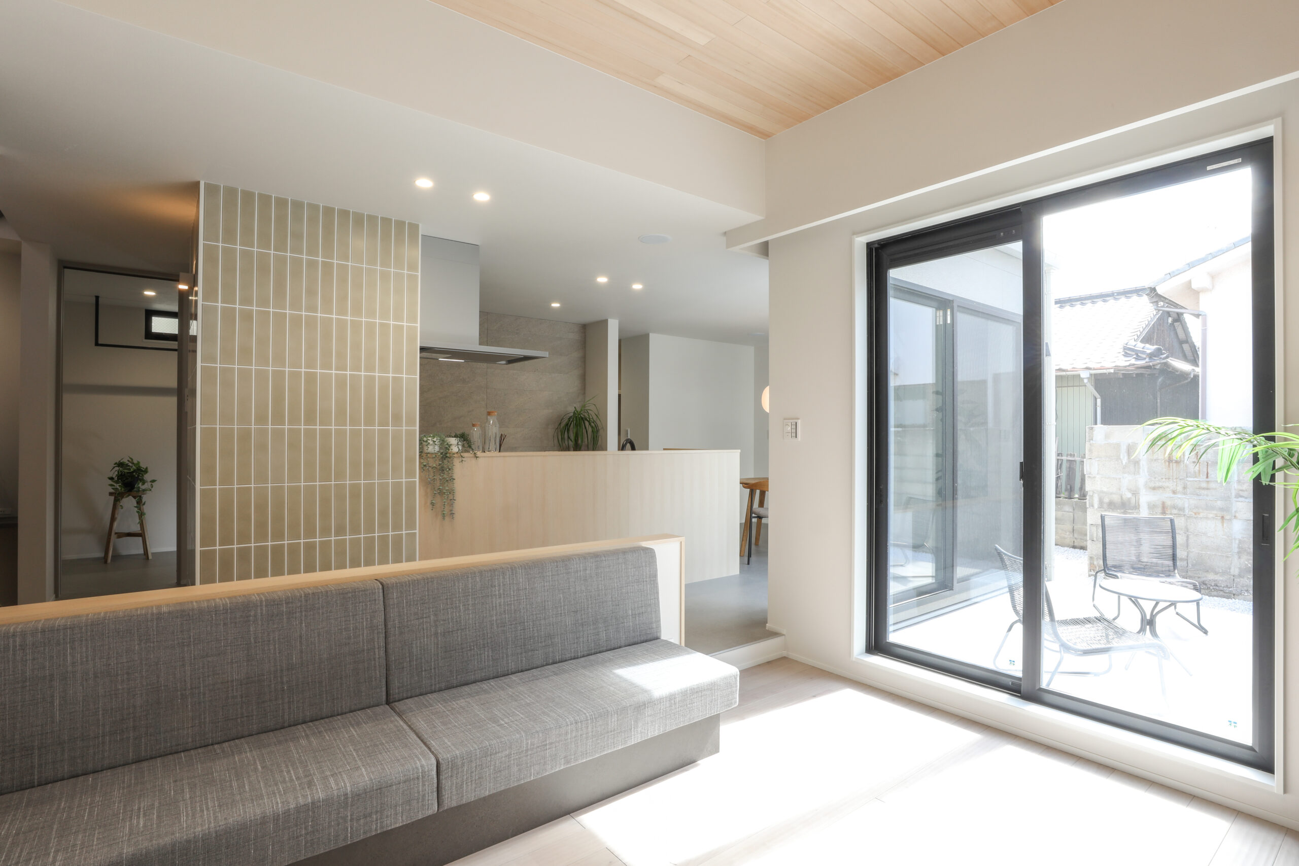 リビングやキッチンの腰壁、カップボードなどには柔らかい色味の木材